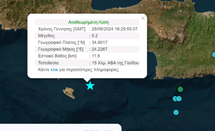 Όπως αναφέρει σε ανάρτησή του ο Γεράσιμος Παπαδόπουλος: «Προ ολίγου, σεισμός μεγέθους 5,2 κοντά στη Γαύδο, στο θαλάσσιο χώρο σε απόσταση περίπου 45 χλμ. νοτίως των Σφακίων. Είναι πολύ νωρίς για να αποφανθούμε αν είναι ο κύριος. Αυτό θέλει δουλειά για να απαντηθεί. Αναμένονται μετασεισμοί. Πάντως ο σεισμός έγινε σε σημαντική απόσταση από την Κρήτη. Αναμένουμε ειδήσεις από τη Γαύδο που βρίσκεται κοντά στο επίκεντρο».