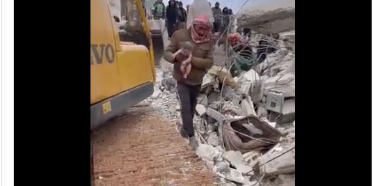 Σε βίντεο που δημοσίευσε δημοσιογράφος στο Twitter, μπορείτε να δείτε τη στιγμή όπου ένας άνδρας, πιθανόν διασώστης, παίρνει το νεογέννητο μωρό και το μεταφέρει σε πιο ασφαλές σημείο, ώστε να λάβει την απαραίτητη ιατρική βοήθεια.