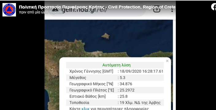 Με ανάρτησή της στα social media η Πολιτική Προστασία Περιφέρειας Κρήτης έγραψε: «Σεισμός νοτίως της Αρβης πριν 7 λεπτά με πρώτη εκτίμηση μεγέθους από το Γεωδυναμικό Ινστιτούτο Αθηνών 5,3 Ρίχτερ!