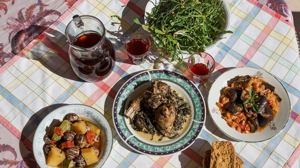 Οι χοχλιοί δε, το αγαπημένο τους έδεσμα, που κάνει θεσπέσιες μαγερειές, θέλουν τέχνη στο μαγείρεμα. Μας την έδειξε η Παγώνα Μανούσακα, σύζυγος του Σήφη και μητέρα των επτά παιδιών του, μια γυναίκα με ανώτερη ηθική, την οποία έχει διδάξει και στην οικογένεια. Μας άνοιξαν το σπίτι τους, την ώρα που η κόρη τους Ασημένια ήταν ετοιμόγεννη. Μαζί με την ξαδέλφη της Ελένη Βουγιούκαλου μαγείρεψαν τις πιο εμβληματικές συνταγές των Σφακίων που θα δείτε στις επόμενες σελίδες. Την τεχνική σάς την αποκαλύπτουμε, για να αποδώσετε όμως τη συμπυκνωμένη νοστιμιά μιας τόσο χαρισματικής τοπικής κουζίνας, που δεν επιδέχεται φτιασιδώματα, θα χρειαστεί να προμηθευτείτε τις καλύτερες πρώτες ύλες: έξτρα παρθένο ελαιόλαδο, ντόπιο κρέας, φρέσκο τυρί και χοντρό αλάτι.