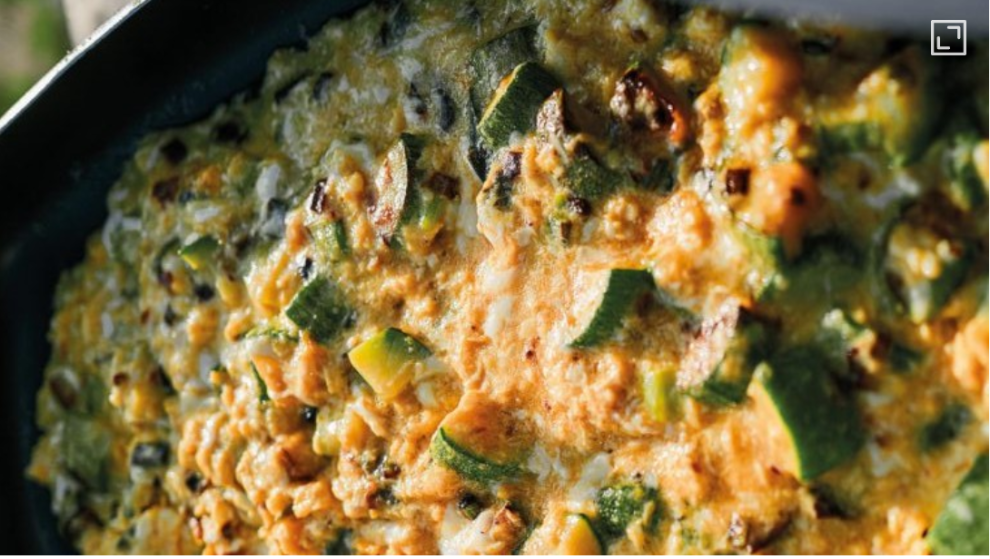 - Ξεσκεπάζουμε, προσθέτουμε τη στάκα, τα χτυπημένα αυγά και αλατοπίπερο και ανακατεύουμε απαλά μέχρι να αναμειχθούν τα υλικά και να πήξει το μείγμα των αυγών, όπως στη στραπατσάδα.