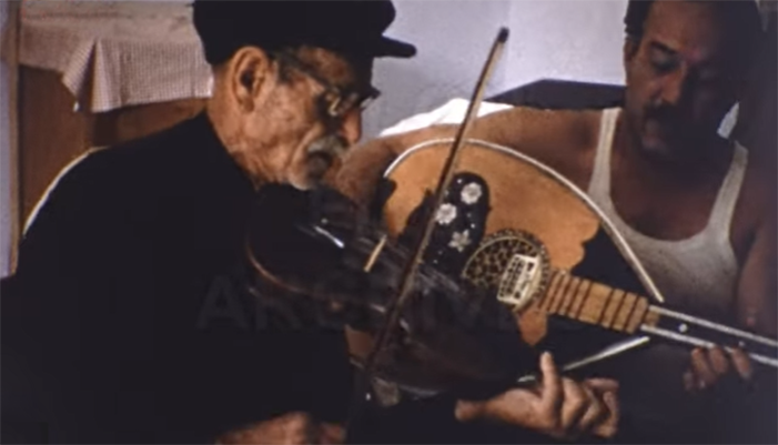Το φιλμ ανοίγει με τον Νικόλαο Χάρχαλη, με τον κινηματογραφιστή να τον ακολουθεί καθώς προχωράει. Ταυτόχρονα ακούμε την φωνή του να λέει “Τώρα θα παίξω έναν σκοπό τον οποίο έπαιζα στα Χανιά στο 1902” και ακολούθως το παίξιμο του. Τον βλέπουμε να κατεβαίνει από έναν κακοτράχαλο δρόμο κι έπειτα να εξέρχεται από ένα μαγαζί αγκαλιά με το βιολί του.