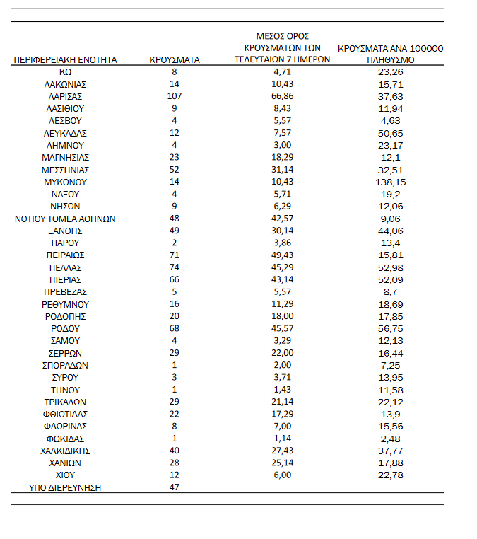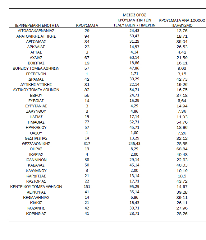 Με βάση τα επιβεβαιωμένα κρούσματα των τελευταίων 7 ημερών, 135 θεωρούνται σχετιζόμενα με ταξίδι από το εξωτερικό και 2.607 είναι σχετιζόμενα με ήδη γνωστό κρούσμα.
