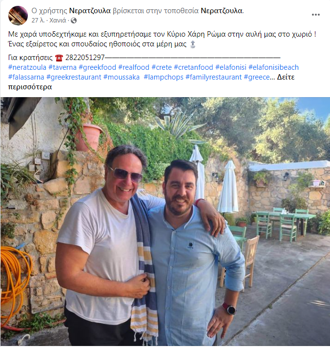 Ο δημοφιλής ηθοποιός και σεναριογράφος Χάρης Ρώμας επέλεξε την Κίσαμο για τις καλοκαιρινές διακοπές του, απολαμβάνοντας τις πανέμορφες παραλίες της περιοχής, αλλά και τα εδέσματα και την Κισαμίτικη φιλοξενία.