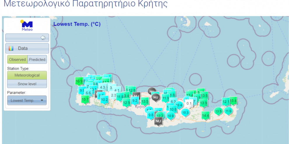 Η πιο παγωμένη γωνιά της Ελλάδας ήταν σήμερα το πρωί το Οροπέδιο Λασιθίου αφού σύμφωνα με το Αστεροσκοπείο/meteo.gr η παρατηρούμενη θερμοκρασία που καταγράφτηκε ήταν περίπου 0! Για την ακρίβεια καταγράφτηκε θερμοκρασία 0,1 στο Οροπέδιο ενώ στο Ασκύφου ήταν 2,6 και στους Αγίους Πάντες 3,9. Τα δεδομένα συλλέγονται από τους μετεωρολογικούς σταθμούς του Εθνικού Αστεροσκοπείου Αθηνών (σημειωμένοι με τετράγωνα) και της Αποκεντρωμένης Διοίκησης Κρήτης (σημειωμένοι με κύκλους). Από το μενού αριστερά είναι δυνατή η επιλογή της παραμέτρου που εμφανίζεται, ενώ υπάρχει ακόμα η δυνατότητα επισκόπησης των χιονομέτρων (snow) αλλά και προγνωστικών πεδίων για τις παραλίες και μεγάλες πόλεις της Κρήτης.