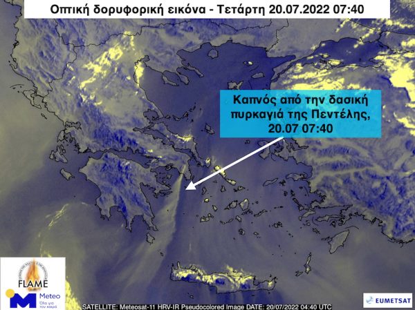Συγκεκριμένα, οπτική δορυφορική εικόνα που έλαβε και επεξεργάστηκε το Εθνικό Αστεροσκοπείο Αθηνών/meteo.gr από τον Ευρωπαϊκό δορυφόρο METEOSAT-11, δείχνει τον καπνό της δασικής φωτιάς της Πεντέλης να έχει μεταφερθεί από τους ισχυρούς βόρειους και βορειοανατολικούς ανέμους τουλάχιστον 400 χιλιόμετρα νότια-νοτιοδυτικά προς την θάλασσα των Κυθήρων και το Νοτιοδυτικό Κρητικό Πέλαγος το πρωί της Τετάρτης (20.07.2022 07:40).
