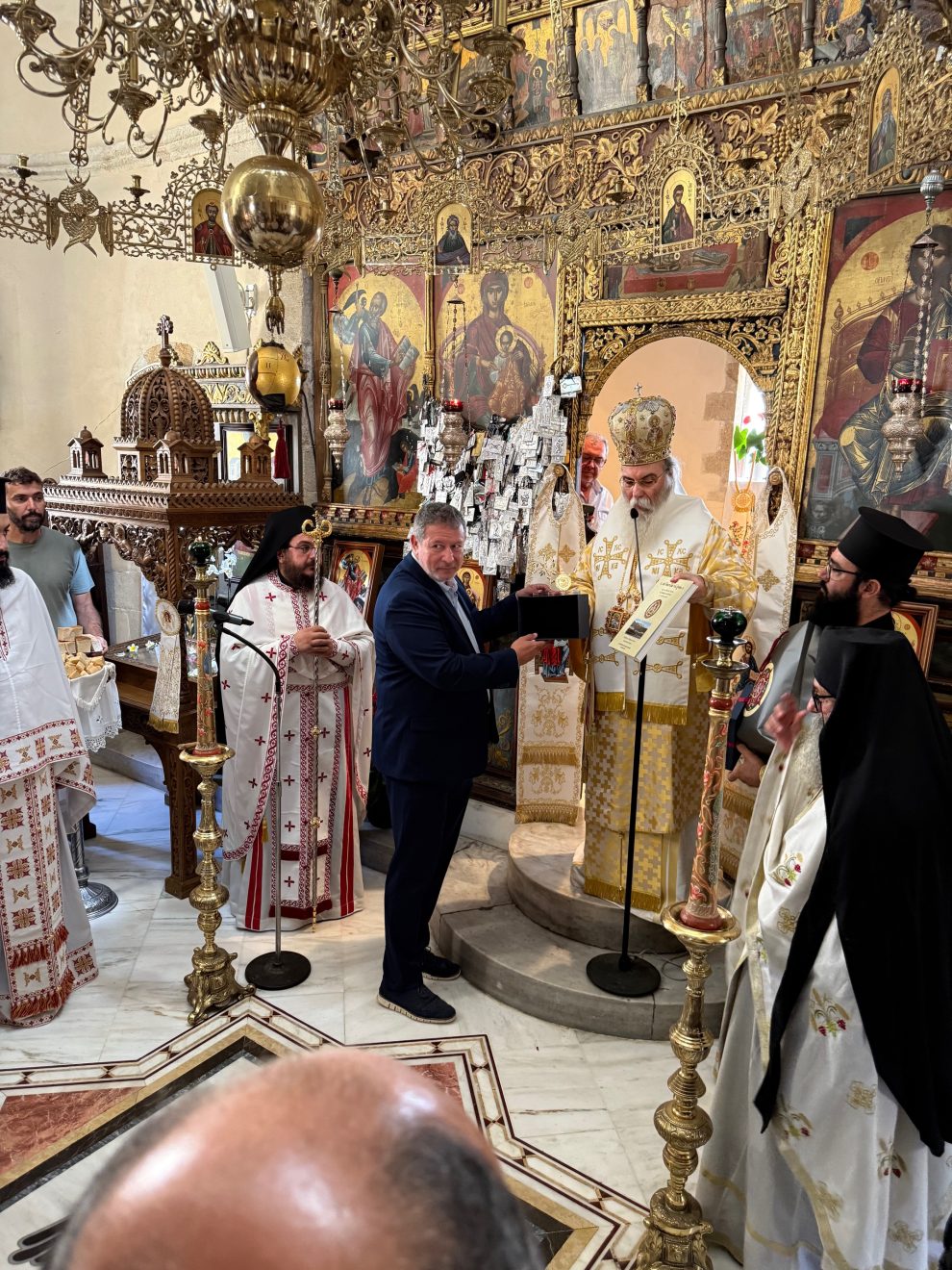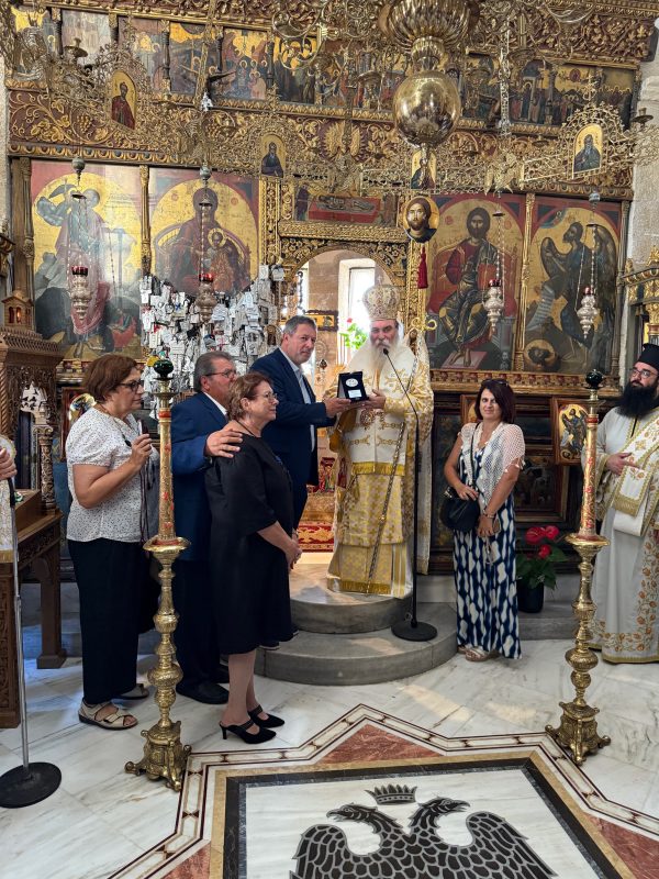 Τιμή και δόξα σε όλους και όλες εσάς, τα απόδημα τέκνα της μάνας Κρήτης, καθώς εξ΄ αιτίας εσάς αυτή η.. ‘άλλη Κρήτη’, ζει στα πέρατα της οικουμένης», κατέληξε ο Σεβ. Μητροπολίτης Κισάμου και Σελίνου κ. Αμφιλόχιος, προσφέροντας στον Πρόεδρο του Παγκοσμίου Συμβουλίου Κρητών κ. Νίκο Καστρινάκη, επετειακό ενθύμημα 50 ετών της Ορθοδόξου Ακαδημίας Κρήτης, ως και επετειακό Τόμο της Αγίας και Μεγάλης Συνόδου της Ορθοδόξου Εκκλησίας. Ακολούθως ο Πρόεδρος του Παγκοσμίου Συμβουλίου Κρητών κ.Καστρινάκης, χαιρέτισε και ευχαρίστησε τον λειτουργό Ιεράρχη κ. Αμφιλόχιο, προσφέροντας τιμητική πλακέτα του Π.Σ.Κ.