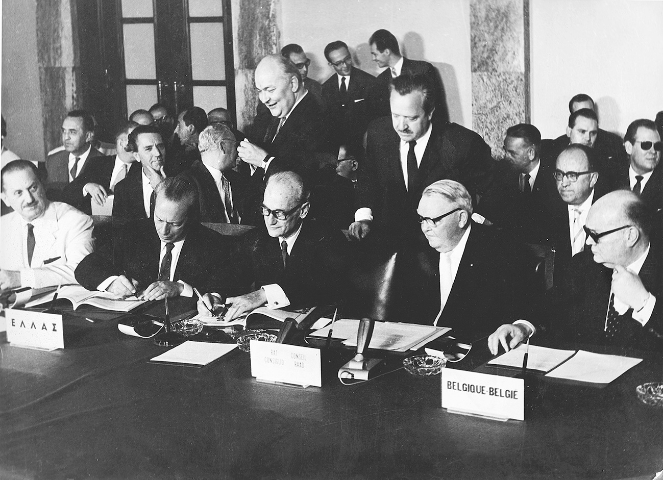 Έτσι, το μεσημέρι της Κυριακής, 9 Ιουλίου του 1961, στην Αίθουσα Τροπαίων της Βουλής, υπογράφτηκε επίσημα η συμφωνία σύνδεσης Ελλάδας-Ε.Ο.Κ. Από ελληνικής πλευράς την υπέγραψαν ο αντιπρόεδρος της κυβέρνησης Παναγιώτης Κανελλόπουλος, ο υπουργός Συντονισμού Αριστείδης Πρωτοπαπαδάκης και ο υπουργός Εξωτερικών Ευάγγελος Αβέρωφ. Εκ μέρους του Βελγίου υπέγραψε ο υπουργός Εξωτερικών Πολ-Ανρί Σπάακ, εκ μέρους της Γαλλίας ο υπουργός Εξωτερικών Ζακ Μορίς Κουβ ντε Μιρβίλ, εκ μέρους της Ιταλίας ο υπουργός Βιομηχανίας και Εμπορίου Εμίλιο Κολόμπο, εκ μέρους του Λουξεμβούργου ο υπουργός Εξωτερικών Ευγένιος Σάους.