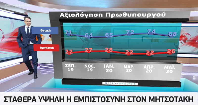 Σταθερά υψηλή είναι η δημοφιλία και η εμπιστοσύνη των πολιτών στον πρωθυπουργό, Κυριάκο Μητσοτάκη, ο οποίος απολαμβάνει το υψηλότατο ποσοστό του 68% έναντι μόλις 26% αρνητικής αξιολόγησης.