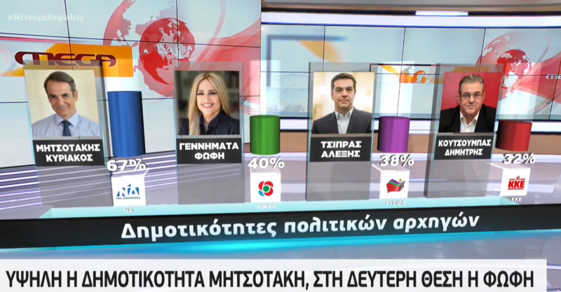 Σταθερά πρώτος σε δημοτικότητα ο Κυριάκος Μητσοτάκης (67%) ενώ δεύτερη έρχεται η Φώφη Γεννηματά με 40%. Τρίτος ο Αλέξης Τσίπρας (38%) και ακολουθεί ο Δ. Κουτσούμπας (32%).