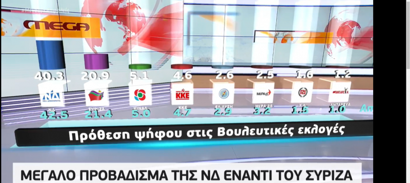 Η Νέα Δημοκρατία εξακολουθεί,4 να προηγείται με μεγάλη διαφορά σχεδόν 20% (19,4%) του ΣΥΡΙΖΑ. Ειδικότερα, στην πρόθεση ψήφου, η ΝΔ λαμβάνει το 40,3%, ο ΣΥΡΙΖΑ 20,9%. Το ΚΙΝΑΛ έρχεται τρίτο με 5% και ακολουθούν ΚΚΕ με 4,7%, ΜέΡΑ 25 με 3,2%. Εκτός Βουλής η Ελληνική Λύση με 2,9%.