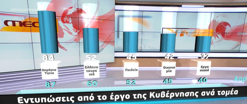 Οι πολίτες εξακολουθούν να έχουν εξαιρετικά θετικές εντυπώσεις από τις επιδόσεις της κυβέρνησης στον τομέα της Δημόσιας Υγείας (84%), στα ελληνοτουρκικά (60%), στην Παιδεί (52%) στην Οικονομία (45%) και στα εργασιακά (40%).