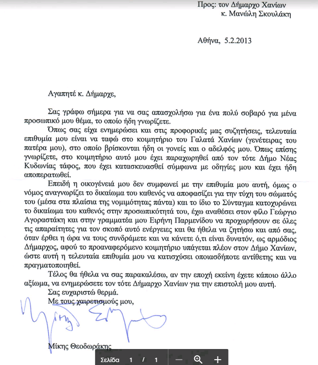 Το περιεχόμενο επιστολής, με την οποία ο αείμνηστος Μίκης Θεοδωράκης  γνωστοποιούσε από το 2013 την επιθυμία του να ταφεί στα Χανιά γνωστοποίησε σήμερα, Παρασκευή 3/9/2021, ο Δήμαρχος Χανίων, Παναγιώτης Σημανδηράκης.