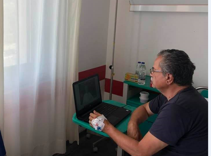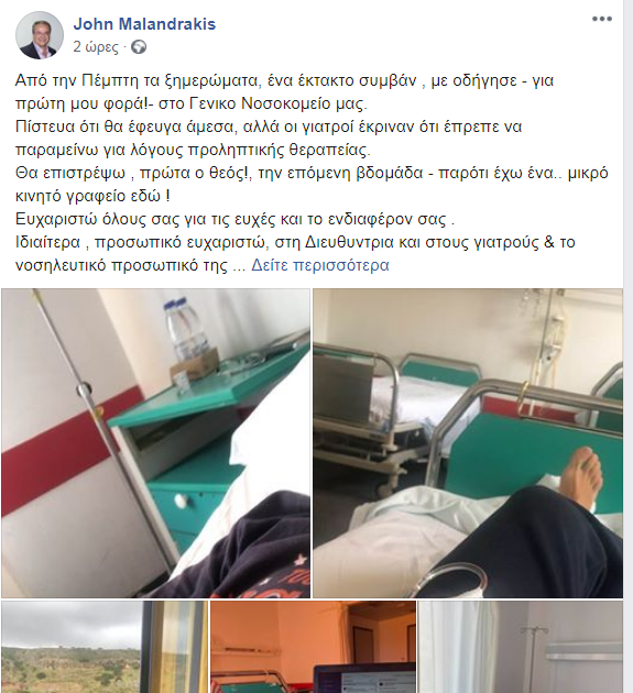 “Από την Πέμπτη τα ξημερώματα, ένα έκτακτο συμβάν με οδήγησε -για πρώτη μου φορά- στο Γενικό Νοσοκομείο μας. Πίστευα ότι θα έφευγα άμεσα, αλλά οι γιατροί έκριναν ότι έπρεπε να παραμείνω για λόγους προληπτικής θεραπείας. Θα επιστρέψω, πρώτα ο θεός, την επόμενη βδομάδα -παρότι έχω ένα μικρό κινητό γραφείο εδώ!