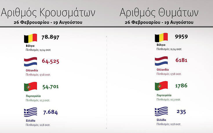 Σε ό,τι αφορά τα κρούσματα, στην Ελλάδα είναι 7.684, πολύ λιγότερα δηλαδή από τα 78.897 του Βελγίου, που έχει πληθυσμό 11 εκατ.