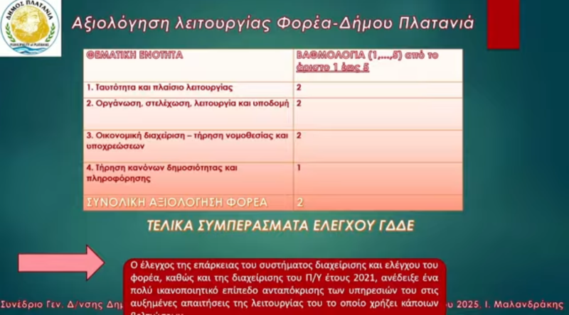 Στην εισήγησή του, ο Δήμαρχος παρουσίασε την εμπειρία του Δήμου Πλατανιά από τους δημοσιονομικούς ελέγχους των τελευταίων ετών, αναδεικνύοντας το ιδιαίτερα ικανοποιητικό επίπεδο ανταπόκρισης των υπηρεσιών του Δήμου, όπως αυτό αποτυπώνεται και στην πρόσφατη αξιολόγηση, όπου ο Δήμος Πλατανιά καταγράφει υψηλές επιδόσεις σε κρίσιμους τομείς λειτουργίας και οικονομικής διαχείρισης.