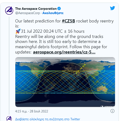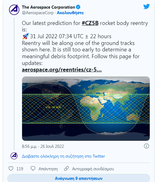 Παράλληλα, δημοσιεύτηκε ένας πρώτος μη λεπτομερής χάρτης για τις πιθανές περιοχές πτώσης του πυραύλου. H επανείσοδος υπολογίζεται να γίνει στις 31 Ιουλίου 2022, σύμφωνα με τον αστροφυσικό Jonathan McDowel.