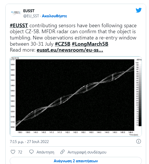 Σύμφωνα με ανάρτηση της ομάδας «Προμηθέας», που ανάρτησε σχετικά γραφήματα, το στάδιο του προωθητικού πυραύλου CZ-5B παραμένει σε μια αργά απομειούμενη χαμηλή τροχιά (κόκκινη γραμμή).