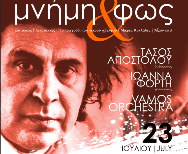 Με σολίστ τους Τάσο Αποστόλου [ βαθύφωνο] και Ιωάννα Φόρτη [ μεσόφωνο] οι Vamos Orchestra θα μας ταξιδέψουν στα εμβληματικά έργα του Μίκη Θεοδωράκη , Επιτάφιος, Λιποτάκτες, Το Τραγούδι του νεκρού αδελφού, Μικρές Κυκλάδες, Άξιον Εστί.