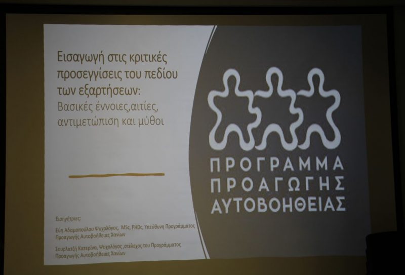 Σε συνέχεια της Προγραμματικής Σύμβασης, που έχει υπογραφεί από τον Δήμο Χανίων με το Αριστοτέλειο Πανεπιστήμιο Θεσσαλονίκης υλοποιείταιτο Πρόγραμμα Προαγωγής Αυτοβοήθειας, εστιάζοντας στη στήριξη και στην ευαισθητοποίησητων συμπολιτών μας, με έμφαση στην πρόληψη της εξάρτησης και άλλων ψυχοκοινωνικών προβλημάτων.