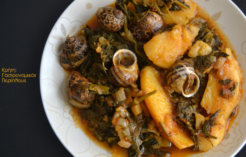 Υλικά: 500 γραμμάρια χοχλιούς, 1 κιλό άγρια χόρτα τσιγαριαστά, 4 πατάτες, 1 μάτσο μάραθο, 2 κρεμμύδια, 3 ντομάτες, 1 κουτ. σούπας πελτέ ντομάτας, αλάτι, πιπέρι.