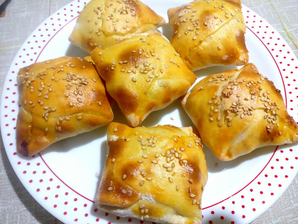 Υλικά για την γέμιση: 3/4 του κιλού μυζήθρα, 3/4 του κιλού ανθότυρο, 1/2 κιλού μαλάκα, 2 αυγά, 1 μεγάλο μάτσο δυόσμο ψιλοκομμένο, αλάτι, 2 αυγά χτυπημένα, σουσάμι για το πασπάλισμα.