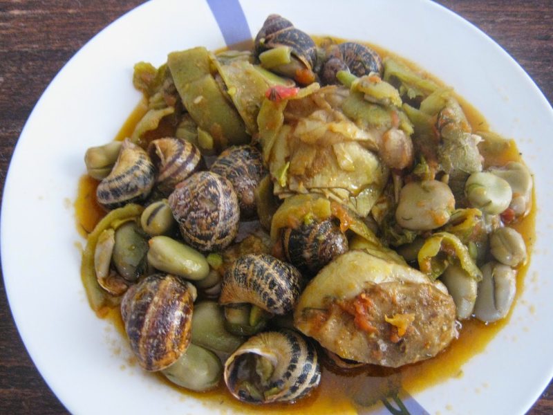Υλικά: Μισό κιλό χοχλιοί, 4 μέτριες πατάτες, 4 – 6 αγκινάρες, 2 – 3 ντομάτες, 2 ξερά κρεμμυδάκια, άνηθο και μαϊντανό, ελαιόλαδο, αλάτι και πιπέρι (αν θέλουμε μπορούμε να προσθέσουμε κολοκυθάκια, καρότα και πράσο).