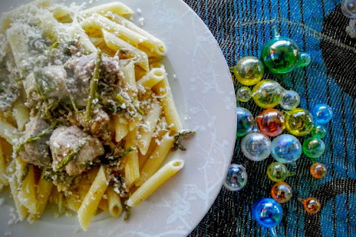 Εκτέλεση: Τσιγαρίζουμε το κρέας σε μπόλικο ελαιόλαδο. Αφού πάρει χρώμα προσθέτουμε το κρεμμύδι και τα τσιγαρίζουμε μαζί. Σβήνουμε με το κρασί, αλατοπιπερώνουμε και σε 3-4 περίπου λεπτά χαμηλώνουμε την φωτιά και σκεπάζουμε. Προσθέτουμε ζωμό σιγά σιγά καθώς ψήνεται το κρέας όταν χρειάζεται. 5 λεπτά πριν κατεβάσουμε το φαγητό από τη φωτιά ρίχνουμε τα σπαράγγια και το θυμάρι. Αφού σβήσουμε την φωτιά προσθέτουμε λίγο ακόμη ελαιόλαδο. Βράζουμε τις πέννες σύμφωνα με τις οδηγίες στη συσκευασία τους και σερβίρουμε με το κρέας, πασπαλίζοντας με τριμμένη γραβιέρα.