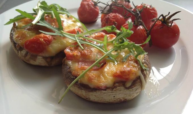 Ανακατέψτε όλα τα υλικά της σαλάτας καπρέζε μαζί σε ένα μπολ. Γεμίστε τα καπάκια των μανιταριών μέχρι να λιώσει το τυρί, περίπου 10 λεπτά.