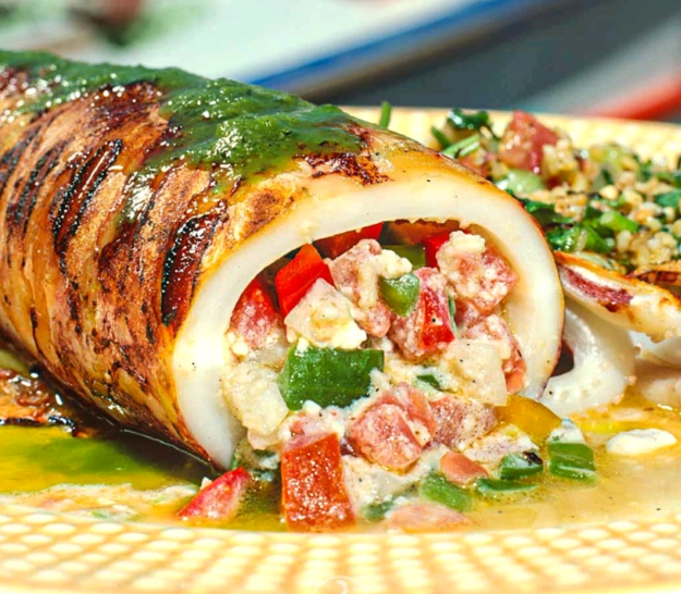 Υλικά: 1,5 φλιτζάνι παρθένο ελαιόλαδο, 1 κιλό μέτρια σε μέγεθος καλαμαράκια, 1 μεγάλο κρεμμύδι, 2 φρέσκα κρεμμυδάκια, 2 κουταλιές της σούπας ψιλοκομμένο άνηθο. 2 φλιτζάνια ρύζι, 2 κουταλιές της σούπας δαμάσκηνα ψιλικομμένα, μισό κουταλάκι μοσχοκάρυδο, χυμός ενός λεμονιού, αλάτι, πιπέρι.