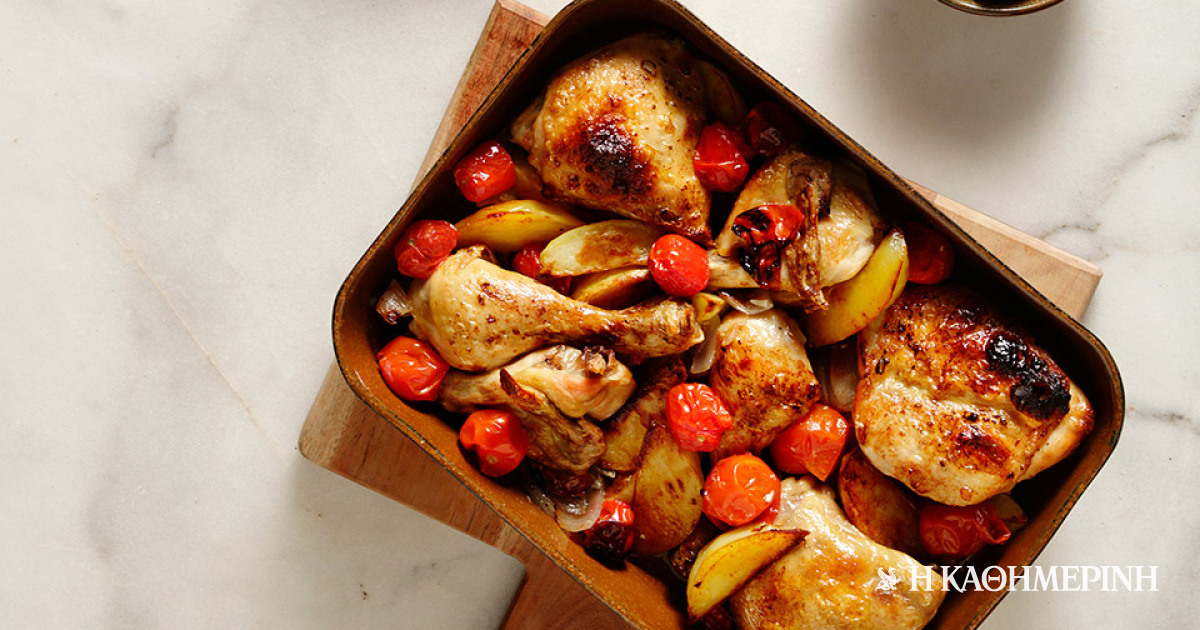 Υλικά (6 μερίδες): 1 κοτόπουλο, 1 1⁄2 κιλό, σε 8-10 κομμάτια, 1,5 κιλό πατάτες, κομμένες κυδωνάτες, 50 γραμμάρια ντοματίνια (προαιρετικά), 2 ξερά κρεμμύδια, σε φέτες, 5 ολόκληρες σκελίδες σκόρδου, 2 φύλλα δάφνης, 250 ml ελαιόλαδο, αλάτι και φρεσκοτριμμένο πιπέρι