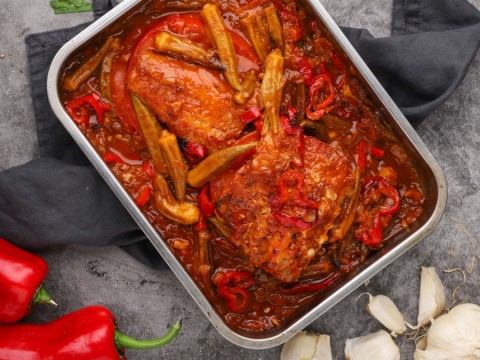 Εκτέλεση: Βάζουµε τον µπακαλιάρο σε νερό για να ξαλµυρίσει. Έπειτα αφαιρούµε τις πέτσες και τα κόκαλα και τον τοποθετούµε στη µέση ενός ταψιού. Πλένουµε και καθαρίζουµε τις µπάµιες, τις τηγανίζουµε ελαφρά και τις βάζουµε στο ταψί γύρω από τον µπακαλιάρο. Τσιγαρίζουµε στο λάδι που έµεινε στο τηγάνι το κρεµµύδι και το σκόρδο, ρίχνουµε αλεσµένες τις ντοµάτες και αλατοπίπερο και αφήνουµε τη σάλτσα να βράσει λίγο. Περιχύνουµε τον µπακαλιάρο µε τη σάλτσα αυτή. Βάζουµε λίγο µαϊντανό από πάνω και ψήνουµε το φαγητό µέχρι να µείνει µε το λάδι του µόνο.