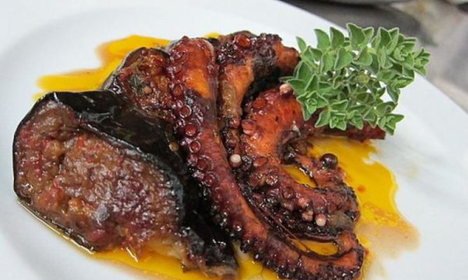 Το χταπόδι με μελιτζάνες και πράσα είναι έτοιμο.