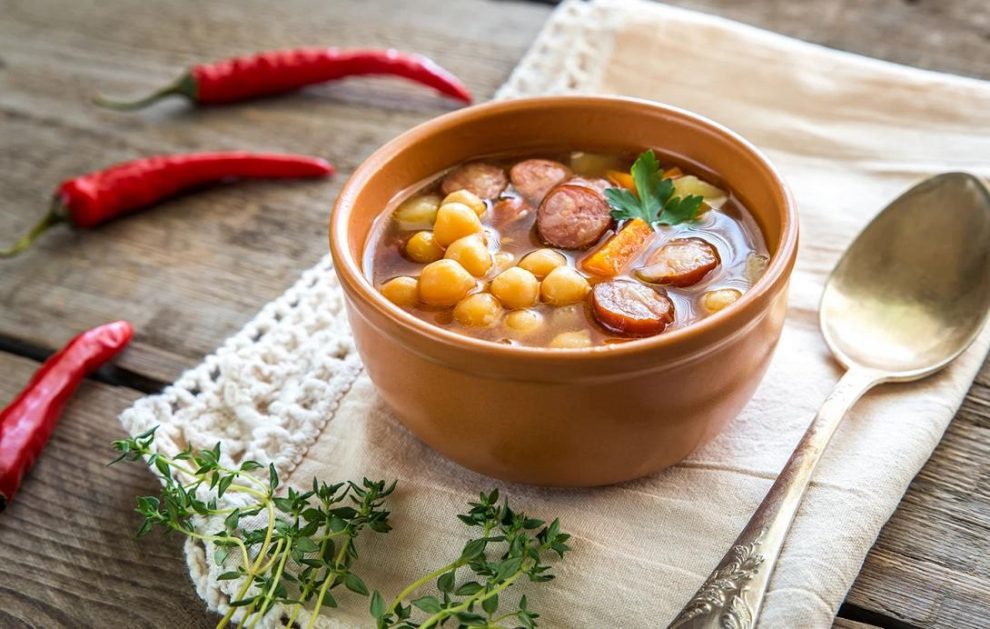 Ρίξτε το λουκάνικο και το λάχανο στο τηγάνι μαζί με τις νιφάδες τσίλι και τα ρεβίθια και, στη συνέχεια, ρίξτε μέσα τον κύβο ζωμού.
