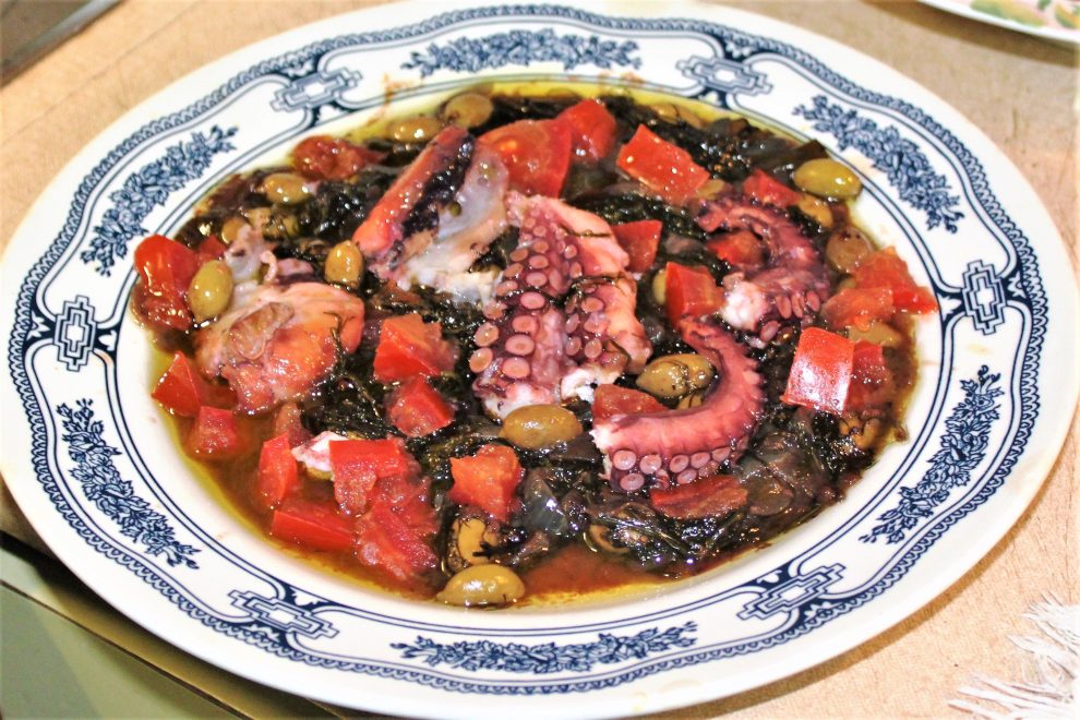 Υλικά: 1 φλιτζάνι παρθένο ελαιόλαδο, 1 κιλό χταπόδι, 1 κιλό μάραθο, 1 φλιτζάνι ελιές πράσινες τσακιστές, 3 φρέσκα κρεμμυδάκια ψιλοκομμένα, 2 μεγάλες ντομάτες λιωμένες, 1,5 φλιτζάνι κόκκινο κρασί αρωματικό, αλάτι ελάχιστο, πιπέρι φρεσκοτριμμένο.