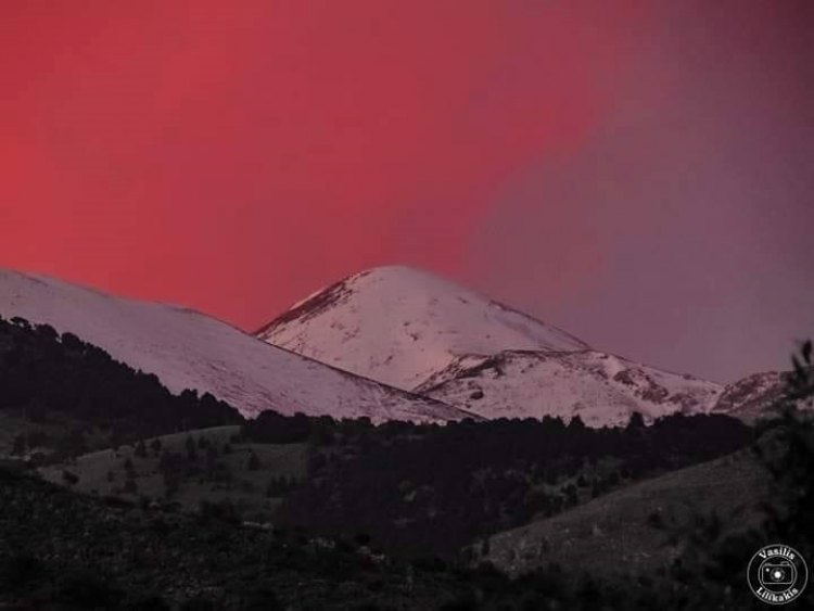 Η φωτογραφία δημοσιεύτηκε στο CretaWeather.gr και δίνει την εντύπωση ότι τα Όρη είναι τυλιγμένα από τις φωτιές του ορίζοντα και το κόκκινο του ουρανού.