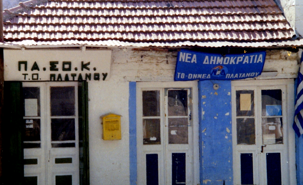 Υπήρχαν τα «μπλε» της δεξιάς και τα «πράσινα» της αντιδεξιάς. Είχαν φτάσει στο σημείο σε πολλά παραταξιακά καφενεία να σερβίρουν τον καφέ σε φλιτζάνια διακοσμημένα με το σύμβολο του κόμματος που υποστήριζαν. Κάποια καφενεία που δεν είχαν πάρει συγκεκριμένη πολιτική θέση το «χρώμα» του φλιτζανιού άλλαζε ανάλογα με την πολιτική ταυτότητα του πελάτη….