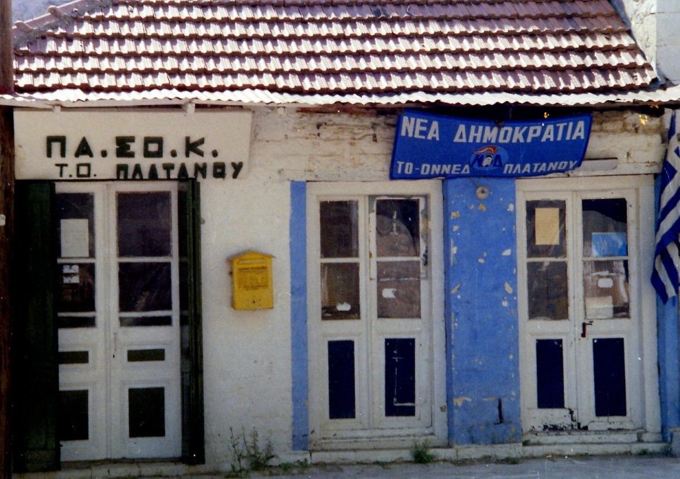 Τα καφενεία ανέκαθεν ήταν χώροι συγκέντρωσης των ανδρών στην επαρχία μετά από τη δουλειά. Συζητούσαν και έπαιζαν τάβλι, πρέφα και δηλωτή ανάμεσα σε βαρέλια με τυριά και παστά, τσουβάλια με φασόλια και ρύζι και βάζα με καραμέλες, καθώς τα περισσότερα λειτουργούσαν και ως παντοπωλεία. Εκείνη την εποχή η Ελλάδα είχε χωριστεί στα δύο. Σε χωριά και κωμοπόλεις, οι οπαδοί του ΠΑΣΟΚ πήγαιναν στα «πράσινα» καφενεία και οι νεοδημοκράτες στα «μπλε»….