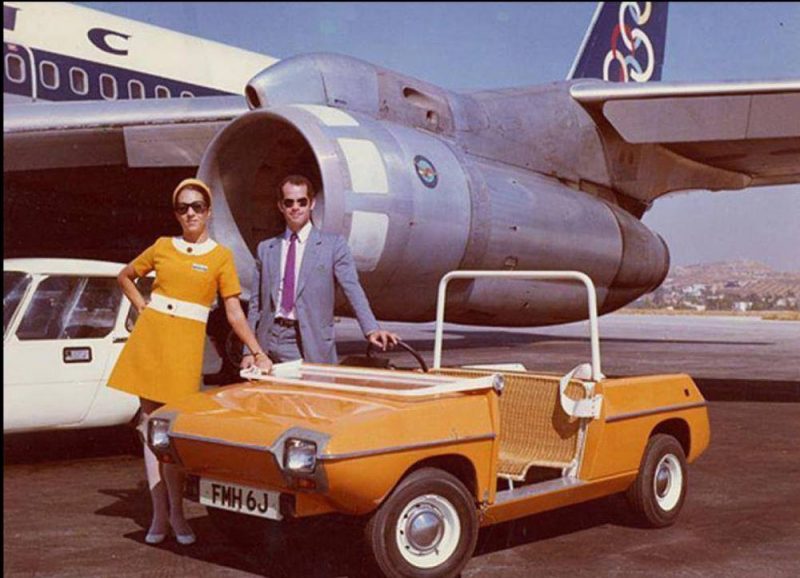 Η διάσημη Ολυμπιακή του Ωνάση με το υψηλό επίπεδο ασφάλειας και άνεσης διακρινόταν για τις πρωτοπόρες επιλογές της. Στην φωτογραφία που τραβήχτηκε στην πίστα του αεροδρομίου του Ελληνικού διακρίνουμε ένα από τα αεροπλάνα της εταιρείας και το ιπτάμενο προσωπικό ντυμένο με τις στολές του διάσημου σχεδιαστή Πιέρ Γκαρντέν. Στέκονται δίπλα σε ένα ηλεκτροκίνητο αυτοκίνητο ελληνικής κατασκευής, που επρόκειτο να ενταχθεί στο στόλο της.