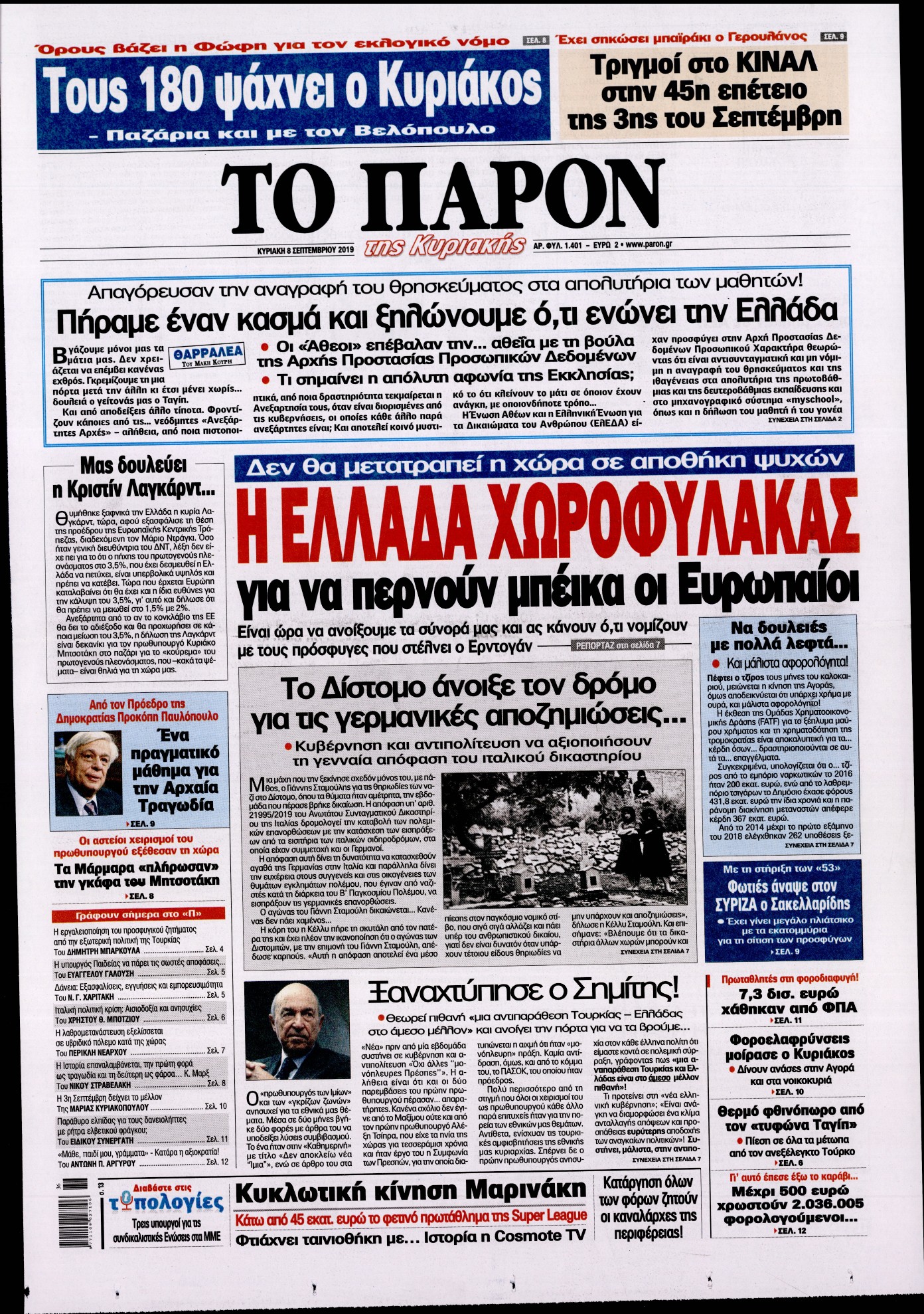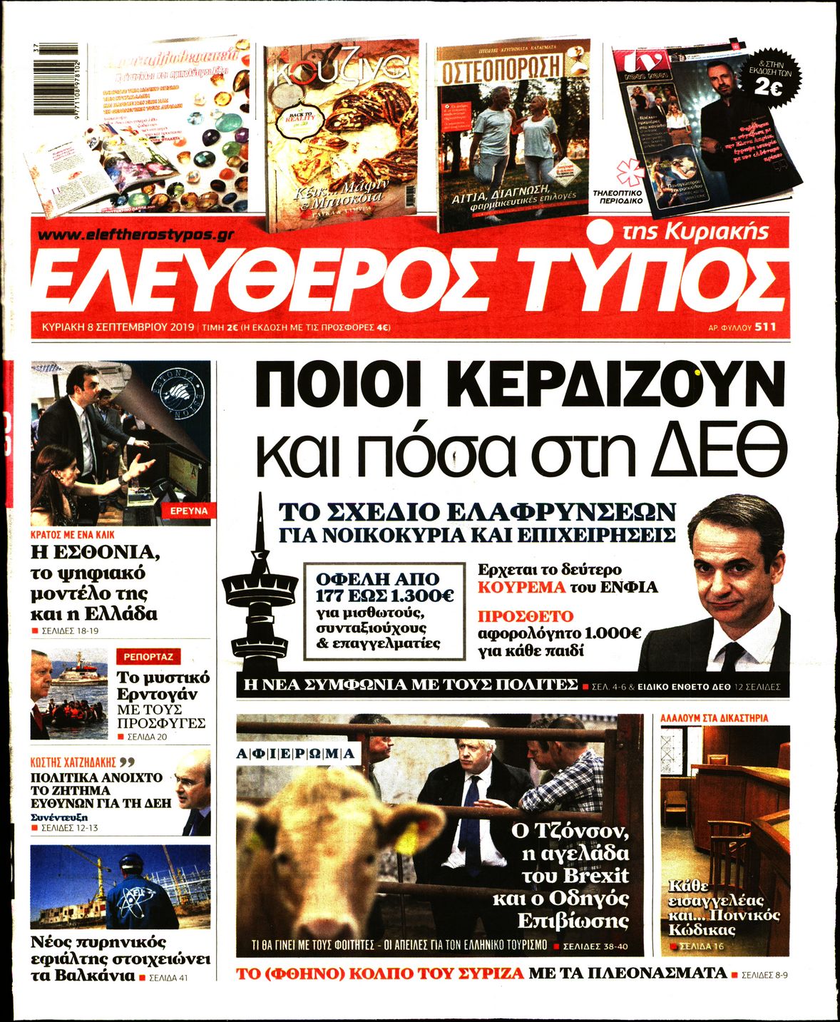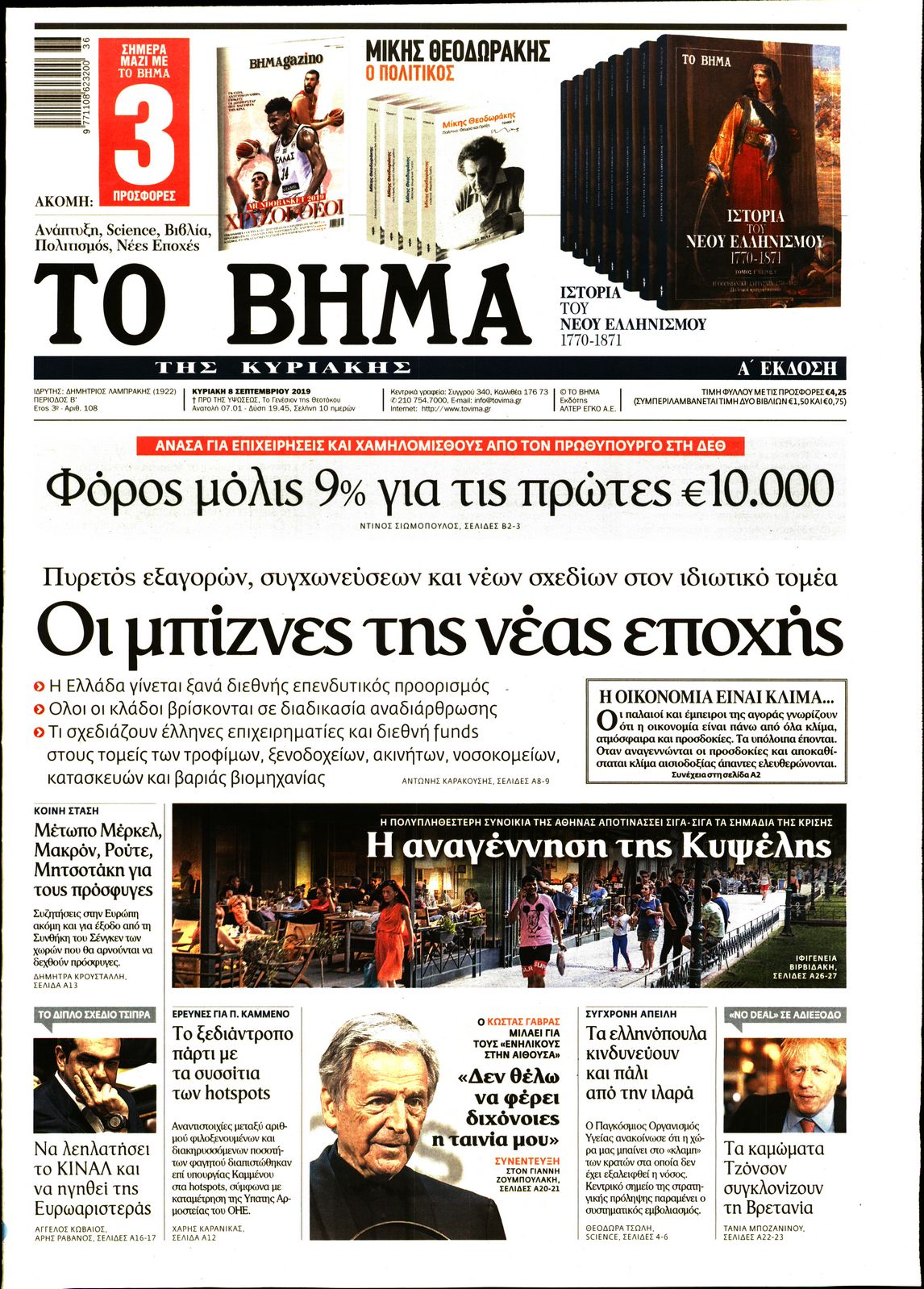 Η ΔΕΘ και οι ανακοινώσεις του πρωθυπουργού αναφορικά με το σχέδιο επιχειρήσεων για τα νοικοκυριά και τις επιχειρήσεις όπως και για το δεύτερο κούρεμα του ΕΝΦΙΑ, οι αλλαγές στη φορολογία, το προσφυγικό και οι «απειλές» της Τουρκίας αλλά και η ανεργία των πτυχιούχων στη χώρα μας είναι από τα βασικά θέματα που απασχολούν τον κυριακάτικο τύπο.