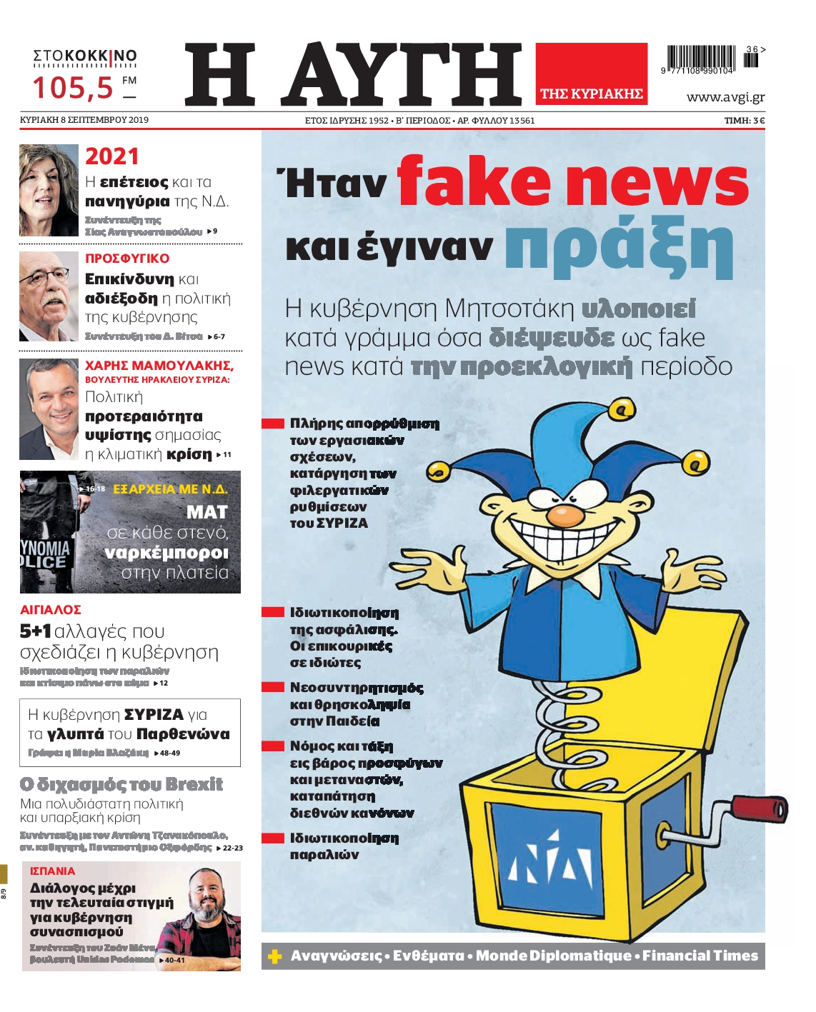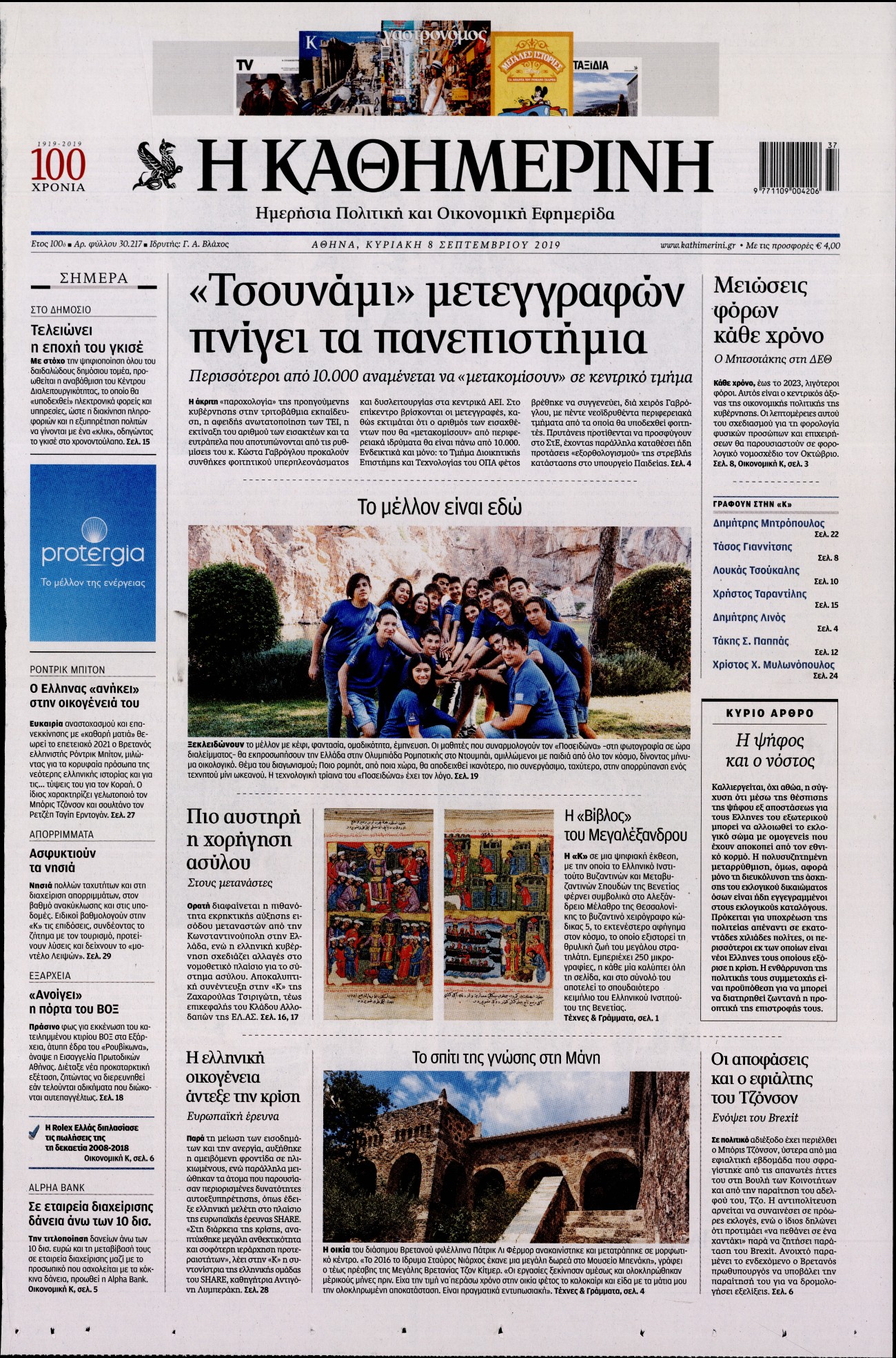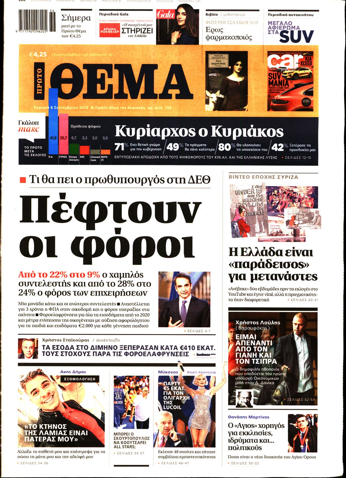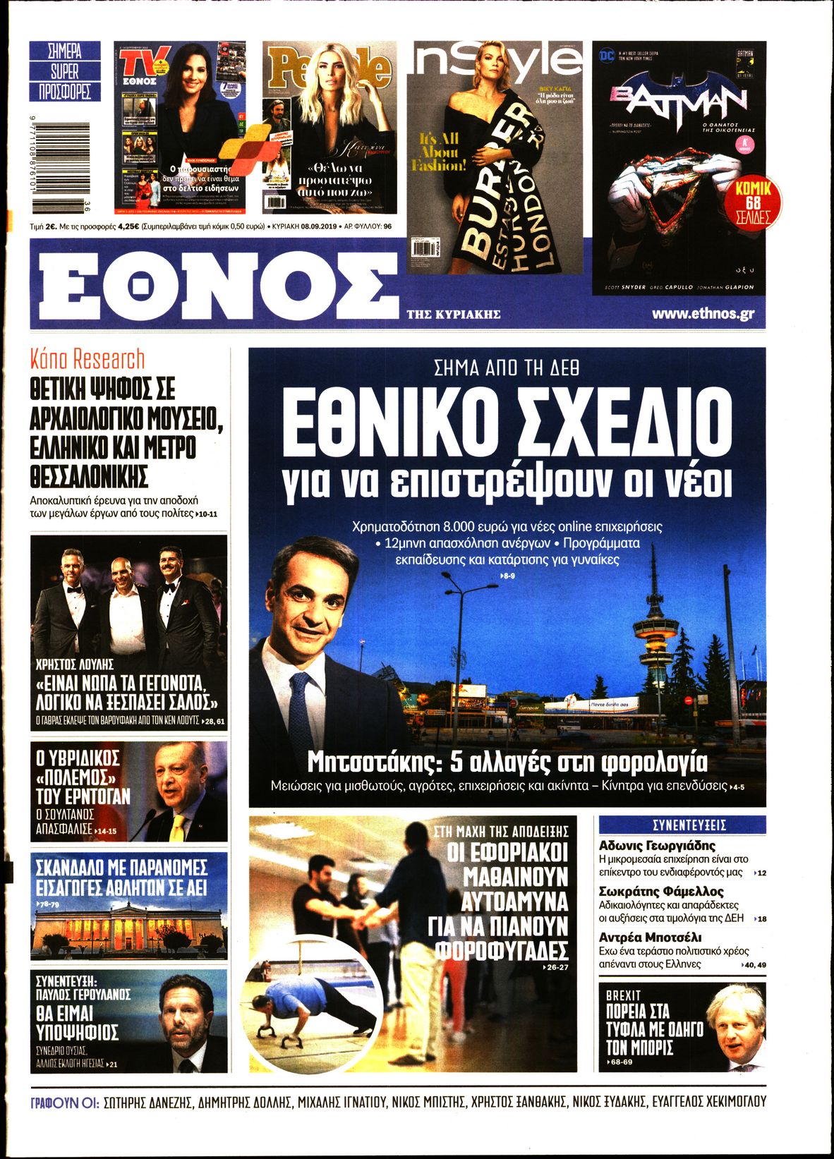 Η ΔΕΘ και οι ανακοινώσεις του πρωθυπουργού αναφορικά με το σχέδιο επιχειρήσεων για τα νοικοκυριά και τις επιχειρήσεις όπως και για το δεύτερο κούρεμα του ΕΝΦΙΑ, οι αλλαγές στη φορολογία, το προσφυγικό και οι «απειλές» της Τουρκίας αλλά και η ανεργία των πτυχιούχων στη χώρα μας είναι από τα βασικά θέματα που απασχολούν τον κυριακάτικο τύπο.