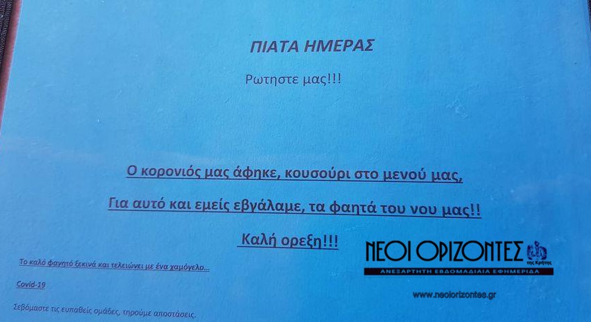 Με μια χιουμοριστική μαντινάδα γνωστοποιεί το… μενού της στους πελάτες της η ταβέρνα “Γλυκερία” στη Χρυσοσκαλίτισσα Κισάμου Χανίων. Και δεν αποκλείεται να γίνει viral!