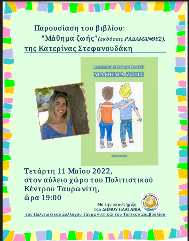 Ο Δήμος Πλατανιά, οι Εκδόσεις Ραδάμανθυς και ο Πολιτιστικός Σύλλογος Ταυρωνίτη παρουσιάζουν το βιβλίο-παιδαγωγικό εργαλείο της εκπαιδευτικού Κατερίνας Στεφανουδάκη, την Τετάρτη 11 Μαΐου 2022, στις 7 το απόγευμα, στον αύλειο χώρο του Πολιτιστικού Κέντρου του Ταυρωνίτη.