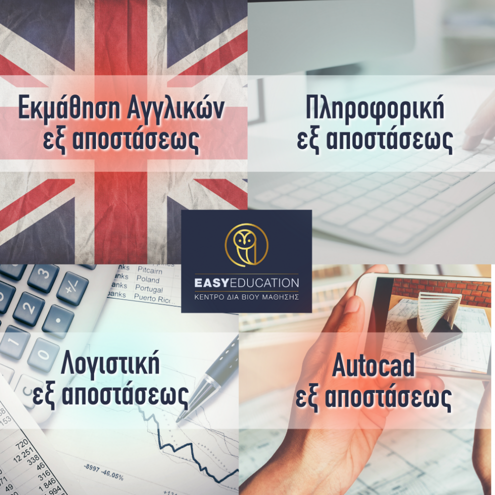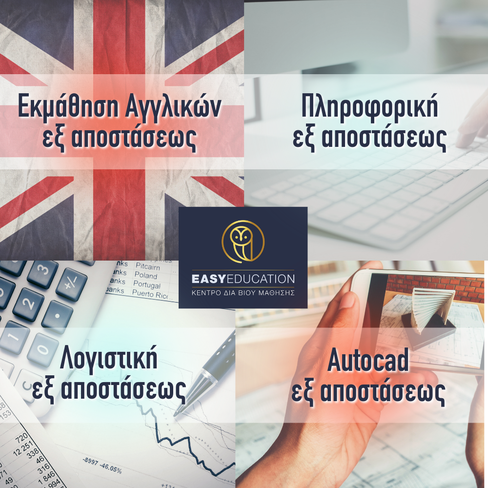 Τα Κέντρα Δια Βίου Μάθησης, Easy Education, σχεδιάζουν και υλοποιούν εξ αποστάσεως ολοκληρωμένο πρόγραμμα κατάρτισης στην Πληροφορική και τα Αγγλικά προς απόκτηση επίσημου πιστοποιητικού, αναγνωρισμένο από ελληνικό δημόσιο, Α.Σ.Ε.Π. αλλά και από ιδιωτικό τομέα, καθώς επίσης και στην Λογιστική και το Autocad.