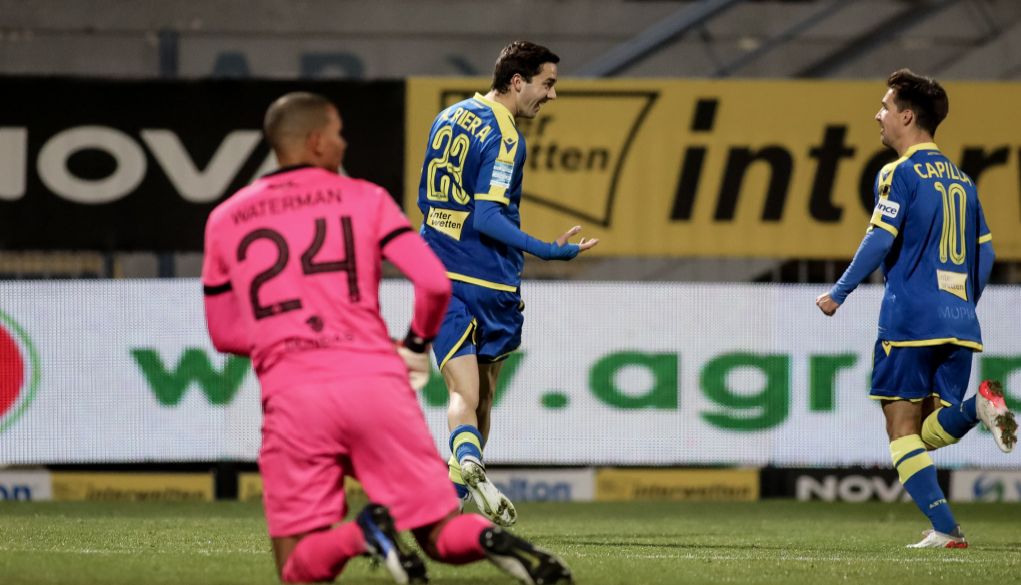 Η ξεκάθαρη υπεροχή του Αστέρα Τρίπολης επιβραβεύτηκε στο 38’. Από πολύ γρήγορη αντεπίθεση των γηπεδούχων έπειτα από κλέψιμο της μπάλας πάνω στον Λάμπρου, ο Καρμόνα βρήκε εξαιρετικά τον Ριέρα μέσα στην περιοχή που πλάσαρε ιδανικά στην κίνηση, κάνοντας το 1-0 για τον Αστέρα.