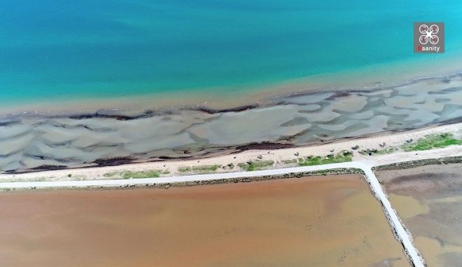 Εκεί όπου η θάλασσα είναι κόκκινη από τη μία πλευρά και μπλε από την άλλη. Το κόκκινο χρώμα το παίρνει από το αλάτι λόγω του ότι έχει πολύ μικρό βάθος. Στη μέση μια λωρίδα γης που δίνει όλες τις αποχρώσεις του καφέ.