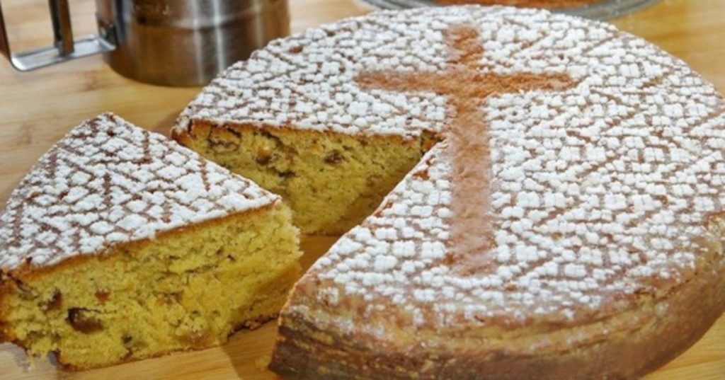Αφήνουμε τη φανουρόπιτα να κρυώσει και μετά την κόβουμε.