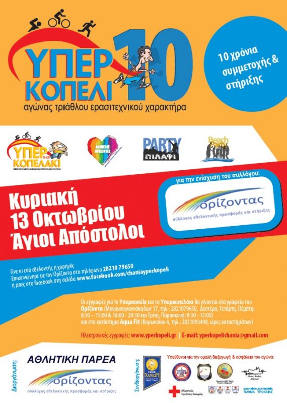 Για δέκατη χρονιά φέτος στα Χανιά, το γνωστό πια σε όλους μας «Υπερκοπέλι», που διοργανώνει η Αθλητική Παρέα του «Ορίζοντα», για τη στήριξη παιδιών και ενηλίκων που πάσχουν από καρκίνο. Μία ημέρα γεμάτη με πολλές δράσεις, αθλητικές, ψυχαγωγικές, πολιτιστικές, όλες με πνεύμα αλληλοστήριξης και αλληλεγγύης.