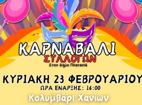 Το 1ο Καρναβάλι των Συλλόγων στον Δήμο Πλατανιά είναι γεγονός!! Για πρώτη χρονιά οι Πολιτιστικοί Σύλλογοι του Δήμου Πλατανιά διοργανώνουν, υπό την αιγίδα του Δήμου Πλατανιά, καρναβαλική παρέλαση την Κυριακή 23 Φεβρουαρίου και ώρα 16:00, στο Κολυμπάρι. Με πολύ κέφι, όρεξη και διάθεση για γλέντι και χορό, 18 καρναβαλικές ομάδες σας προσκαλούν να ξεφαντώσετε μαζί τους και να ζήσετε το εορταστικό και κλίμα της Αποκριάς στον Δήμο Πλατανιά! Την μουσική επιμέλεια του καρναβαλιού θα έχουν οι DJs Ανδρέας Γαρυφαλής και Πέτρος Σαράντος ενώ στην παρουσίαση θα είναι ο Δημήτρης Ηλιάκης. Η παρέλαση θα ξεκινήσει από το σταυροδρόμι Κολυμπαρίου και θα καταλήξει στην πλατεία, στο Κάτω Κολυμπάρι, όπου θα ακολουθήσει πάρτι με πολλές εκπλήξεις για μικρούς και μεγάλους!