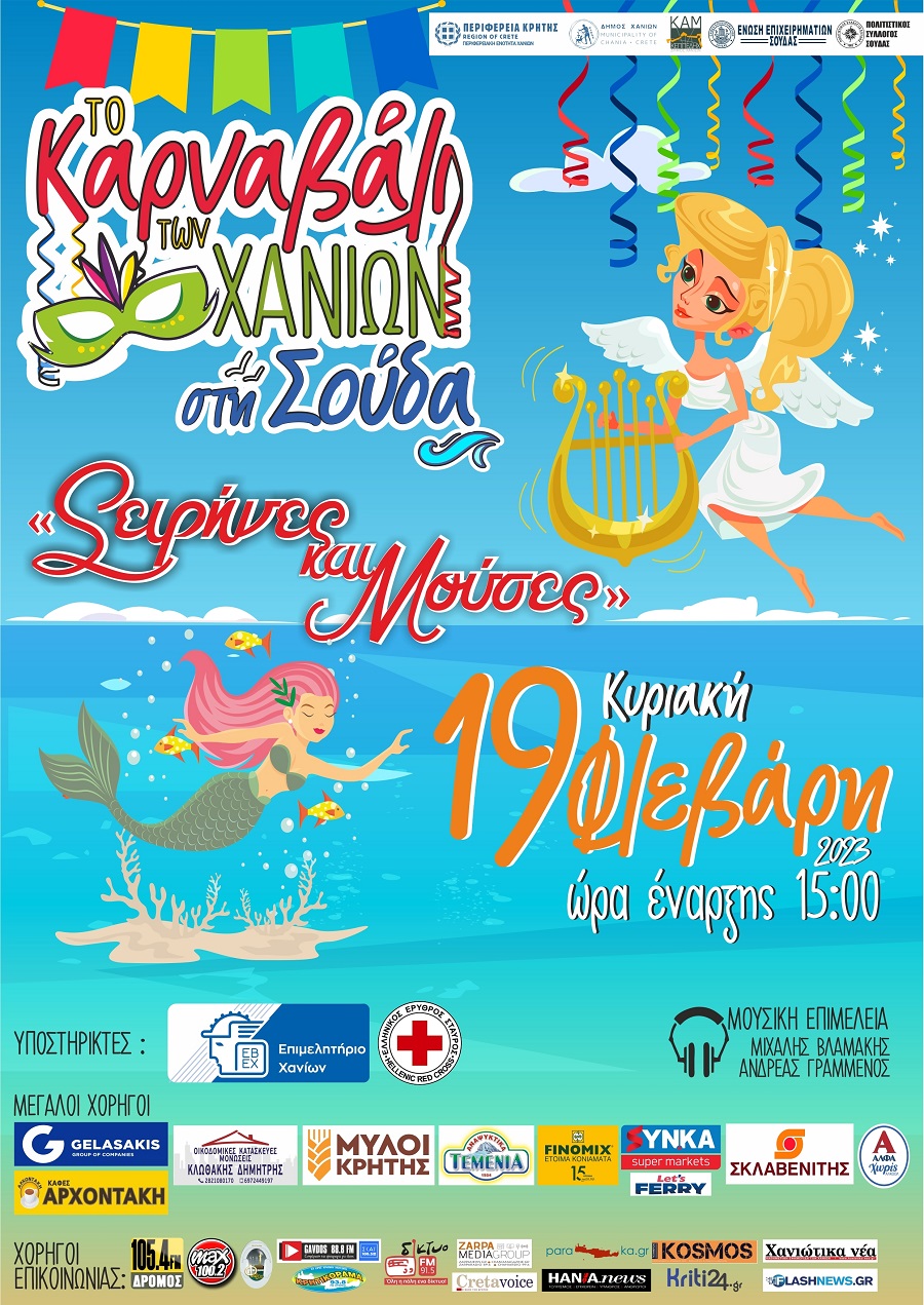 Το Χανιώτικο Καρναβάλι για ακόμα μια χρονιά διοργανώνεται από τον Δήμο Χανίων, την Κ.Ε.Π.ΠΕ.ΔΗ.Χ.-Κ.Α.Μ., την Περιφέρεια Κρήτης, σε συνεργασία με την Ένωση Επιχειρηματιών Σούδας και τον Πολιτιστικό Σύλλογο της περιοχής. Φέτος λοιπόν, κεντρικό θέμα του καρναβαλιού θα είναι η Κρητική Μυθολογία.